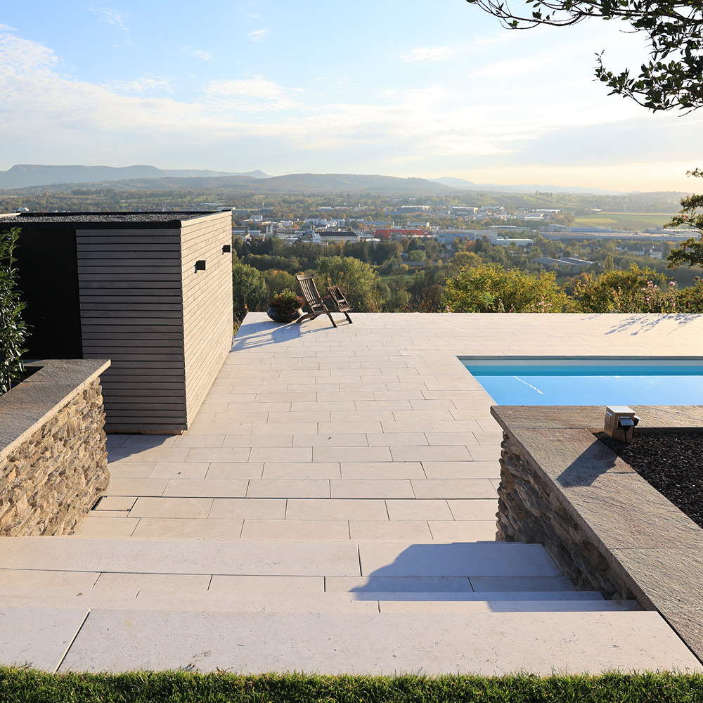 Wir kombinieren die Schönheit und Beständigkeit von Natursteinen und Mosaikfliesen mit innovativem Design, um einen Pool zu schaffen, der nicht nur ästhetisch ansprechend ist, sondern auch einzigartig und zeitlos wirkt.